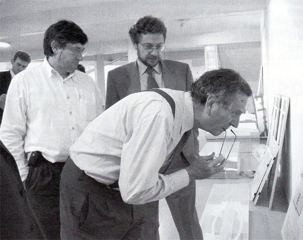 *En la tercera foto: Rafael Moneo, junto al ex alcalde Julio Revuelta, en el sótano del Ayuntamiento durante la selección como jurado de llos proyectos arquitectónicos para la construcción de Vivienda Protegida. Octubre de 2001. El edificio y sus usos fueron diseñados y determinados por el arquitecto Rafael Moneo.