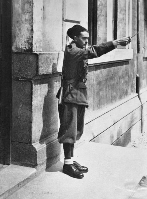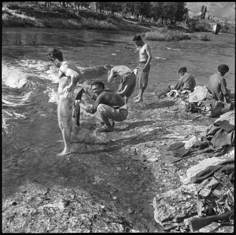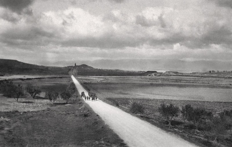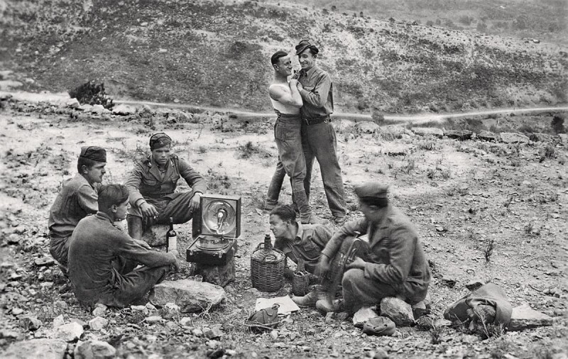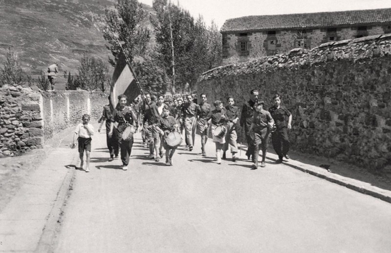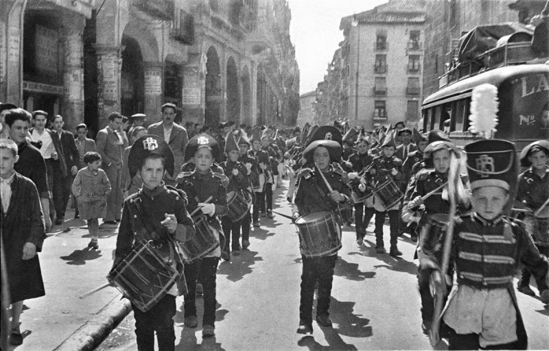 Como a todos, a Julián Loyo le pilló la guerra. Por imposición tuvo que acoger –no en su casa como le ocurría a muchos ciudadanos- sino en su laboratorio a varios militares que ejercían de fotógrafos en el ejército italiano, con los que terminó haciendo amistad. “Dicen que es sabido por los fotógrafos que la luz roja del laboratorio invita a las intimidades, las confesiones, los chismes y a compartir fórmulas secretas”. Así que, en aquellos años, el Laboratorio de Loyola se convirtió en un ir y venir de negativos, productos químicos y probetas. “Como resultado –recuerda el catálogo- un tendedero del que colgaban diversas versiones de la misma España. Tantas como autores”. En un Logroño en el que la guerra no parecía tal, en una ciudad en retaguardia, en las imágenes del Laboratorio de Loyola destacan los desfiles, soldados en los cafés, cortejando, fumando, entierros, “pero guerra, lo que se dice guerra poca”.