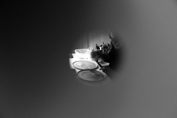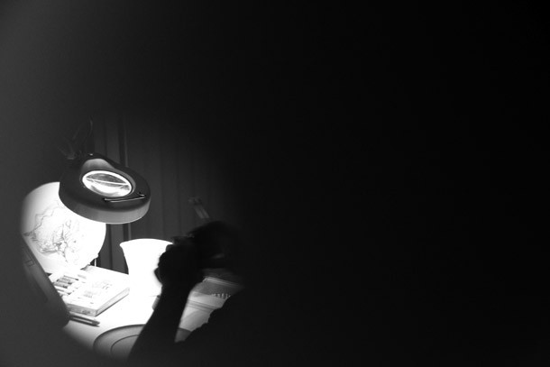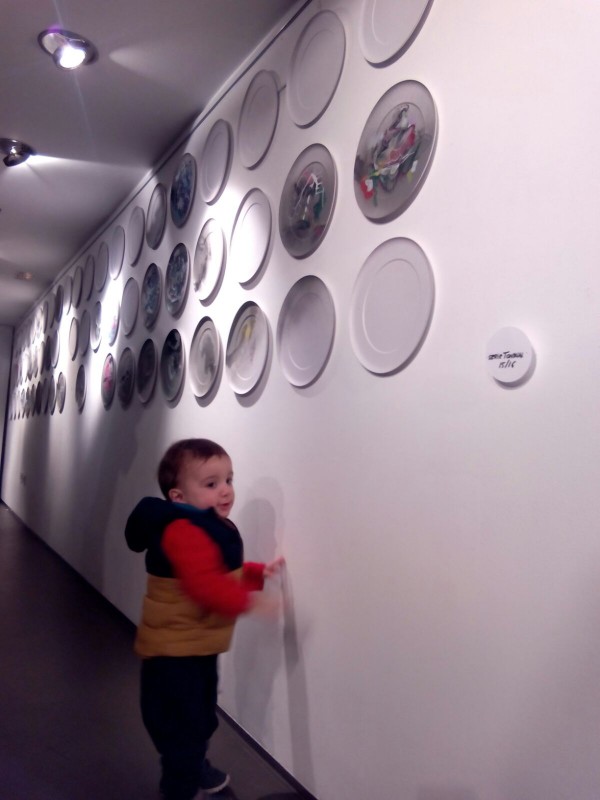Situadas a diferentes alturas, las pequeñas mirillas permiten seguir la labor de Carlos Corres. Ha elegido unos platos de cartón gris como soporte de sus dibujos. Mientras realiza pruebas de color aclara que el proyecto nada tiene que ver con la gastronomía, “el soporte es tan sólo una excusa”. Apunta más bien a una reflexión sobre la vida o al hecho de haber alcanzado una edad en la que le apetecía recapacitar. “He llegado a un punto en mi vida –describe- en que necesitaba echar una mirada atrás y enseñar a la gente todo lo que he ido cultivando desde que era pequeño”. Recuerda que se carrera artística ha estado definida por la pintura. “Ahora –reitera- me ilusiona y me divierte generar en el espacio en blanco formas; hago lo mismo que un niño pero con el bagaje de la experiencia acumulada”.