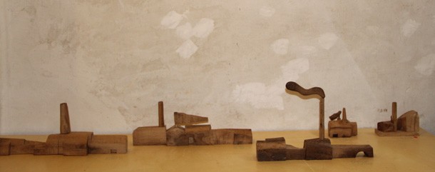 Carlos de Flores es el Gulliver lanza la invitación a mimetizarse con su arquitectura que seduce a quien la observa. La explicación sobre la fascinación que provocan esas casas a reducida escala quizá haya que buscarla en la forma de concebirlas y crearlas. “Un método próximo a lo artesanal –explica el catálogo-, tanto en la búsqueda y la utilización de la materia prima, como la forma de trabajar la madera”. De Flores rastres en busca de vigas de madera con varios siglos de edad que hayan cumplido una función constructiva y posteriormente hayan sido desechadas como material de derribo. Un vez en su taller recurre a las herramientas tradicionales para moldear el roble –siempre roble-… serruchos, garlopas, limas, escofinas, cepillos…