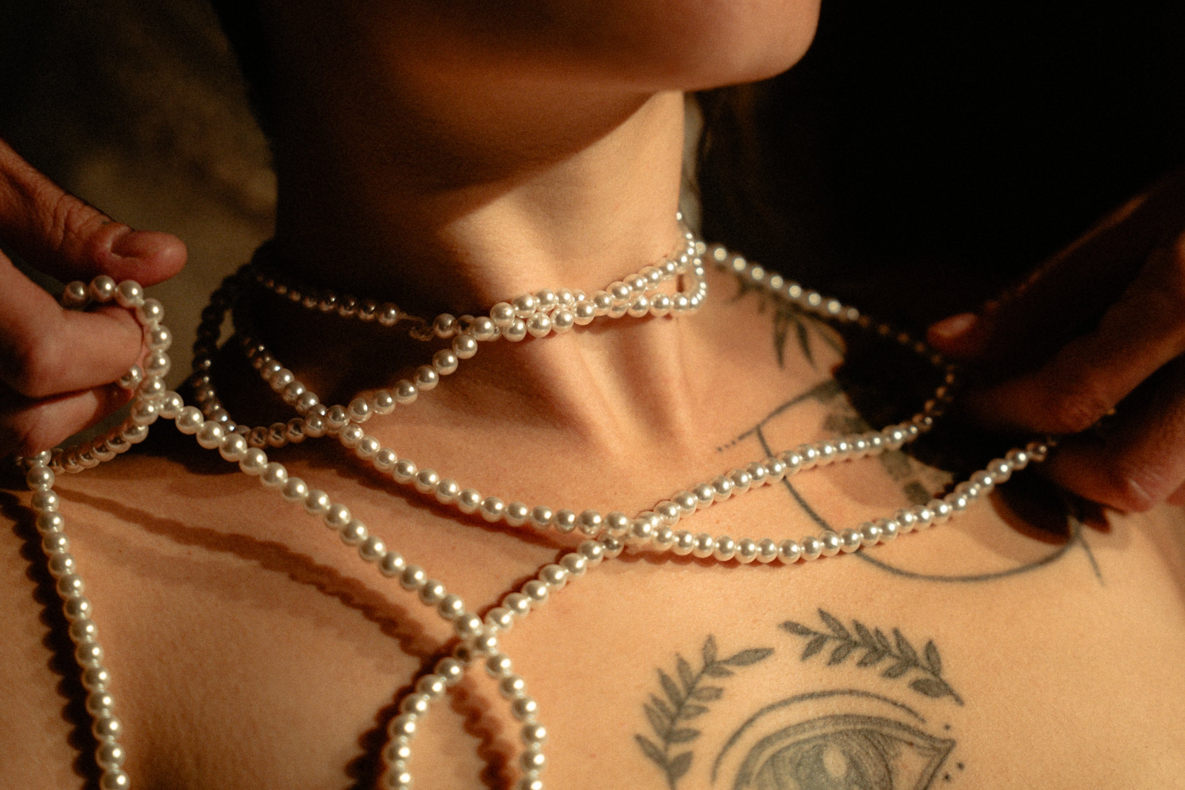 "Dos cuerpos que se reconocen en la cercanía, en la respiración compartida. Las perlas recorren la piel y marcan el ritmo de una entrega consciente. Hay manos que guían, bocas que se detienen en un instante eterno. Es un juego de control desde la delicadeza. Este no es un encuentro para mirar rápido: es una atmósfera donde introducirse. Una línea invisible de erotismo entre dos mujeres, imposible de ignorar". Mariana Erato