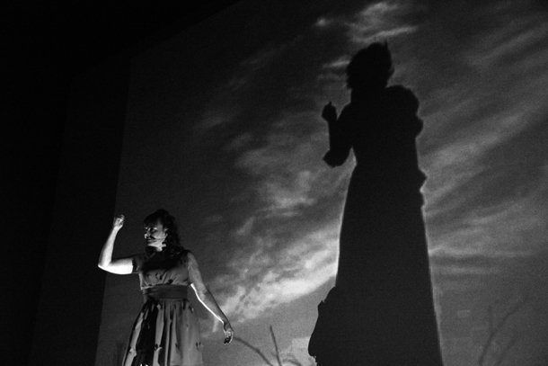 Pero además, ‘Mujeres que no volverán a pasar hambre’ es una extraordinaria obra de teatro, que mantiene al espectador alerta al tener la capacidad de transformar la sala de cine en un teatro en cada uno de sus rincones, incluidas las butacas desde las que los asistentes siguen la interpretación. Un montaje complicado en el que todo tiene que funcionar perfectamente sincronizado y así ocurre. Con una iluminación espectacular en la que el rojo intenso del vestido de la actriz dibuja estelas sobre la oscuridad ligeramente atenuada de la sala y el resplandeciente blanco de la pantalla.