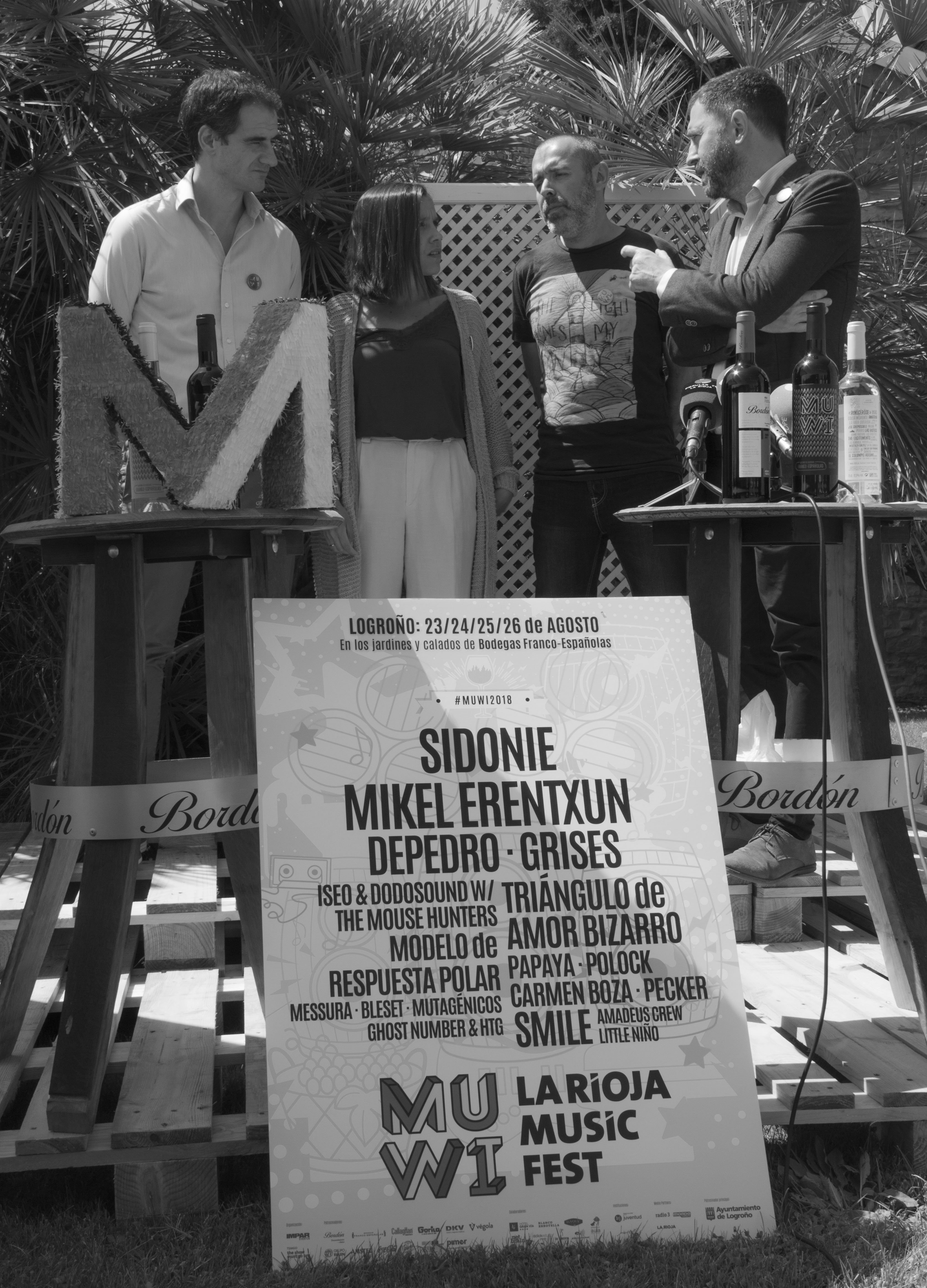 Los jardines de Bodegas Franco Españolas han acogido la presentación del cartel definitivo de la tercera edición de MUWI La Rioja Music Fest. Sidonie, Mikel Erentxun, Depedro, Iseo & Dodosound W/The Mousehunters, Smile, Carmen Boza, Grises, Papaya, Messura, Triángulo de Amor Bizarro, Pecker, Ghost Number & His Tipsy Gypsies, Modelo de Respuesta Polar, Bleset, Mutagénicos y los grupos dirigidos al público familiar e infantil, Amedeus Crew y Little Niño (Descubre a The Beatles' componen el programa que acogerá la centenaria bodega logroñesa del 23 al 26 de agosto. MUWI, en su tercera edición, ha doblado ya el número de abonos respecto a los vendidos en 2017". El dato los proporcinaba José Luis Pancorbo, uno de los responsables de Impar Enventos, empresa organizadora del festival. "Hemos realizado -detalló- una gran labor de evaluación de las ediciones anteriores. Em ambos años se ha enviado un cuestionario para pulsar la opinión de los asistentes con el fin de conocer los puntos de mejora y su opinión tanto sobre la experiencias, como sobre futuros grupos a formar parte del carte de MUWI".