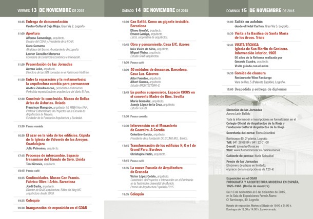 Las jornadas reunirán en Logroño a cerca de doscientos profesionales relacionados con la intervención y reconstrucción de edificios y monumentos -arquitectos, historiadores del arte, aparejadores, arqueólogos pensadores-, procedentes de España, Francia y Portugal. Un encuentro, de carácter bienal, que desde hace treinta y dos años organiza el Colegio de Arquitectos de La Rioja.