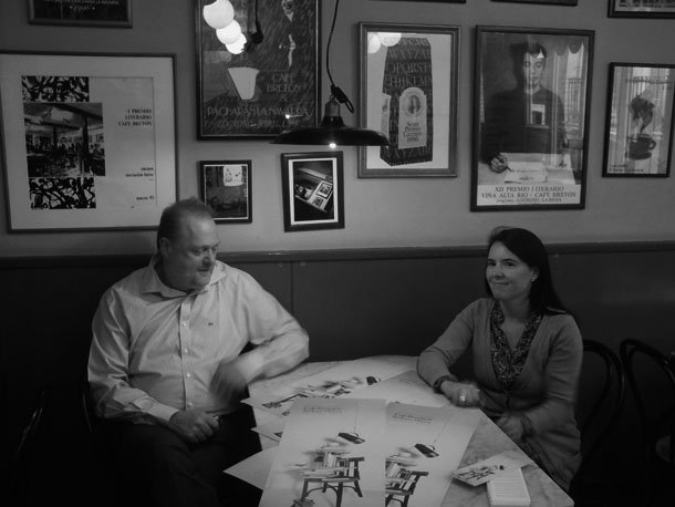 En la terraza interior del Café Bretón es posible repasar uno a uno los carteles promocionales del Premio. Una tarea artístico publicitaria que en esta ocasión ha recaído en Miguel Ropera. La invitación a participar en la XIX edición del Premio se sustenta en un fotomontaje que aúna en perfecto estado de equilibrio los elementos que han dado vida, a lo largo de estos últimos años, a la iniciativa literaria.