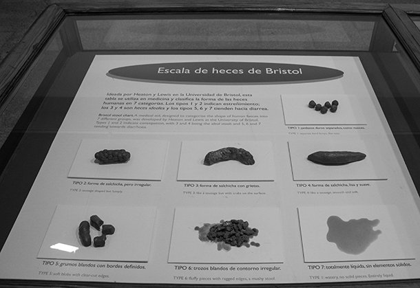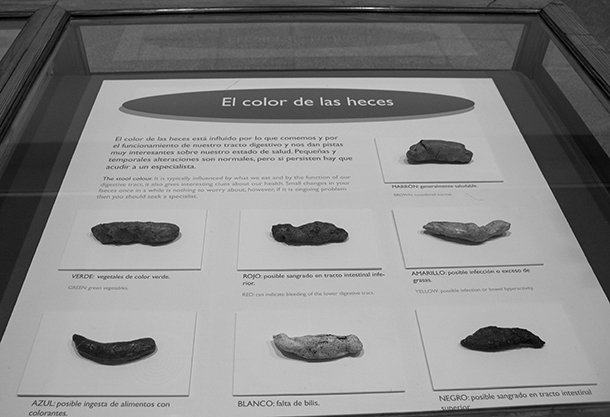 La muestra está dividida en dos ámbitos. 'La excreta en la naturaleza', que trata de su presencia tanto en el mundo animal como en el vegetal. "Al visitar la exposición -recuerda López- te das cuenta de que los tan denostados excrementos son mucho más importantes de lo que parece". El siguiente ámbito, 'La excreta en la sociedad', presenta la información que este elemento puede aportar sobre tu salud y su influencia en nuestro comportamiento. La exposición da a conocer "que los humanos producimos unos 150 gramos de heces y excretamos alrededor de un litro de orina al día. Tenemos que ser conscientes de que la gestión de la excreta también trae complicaciones, como el deshacerse de ella de una forma que no implique riesgos para la salud pública y para el medio ambiente. La canalización de aguas residuales, los inodoros y el reciclaje de los excrementos son fundamentales para conseguirlo"./J.M.