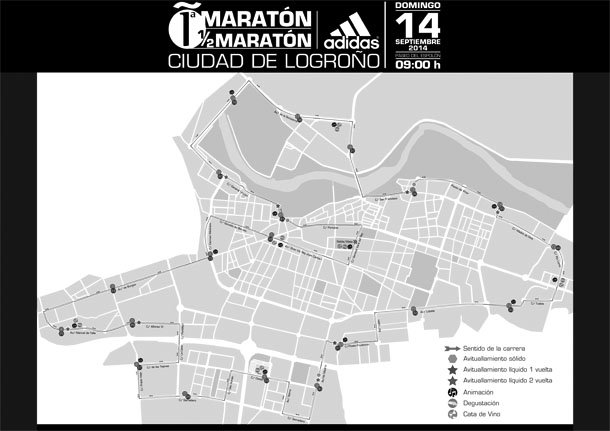 El maratón recorrerá la práctica totalidad de los barrios logroñeses. La salida estará situada en la calle Vara de Rey junto al paseo de El Espolón. Desde ahí, los corredores tomarán la calle Gran Vía, continuarán por Gonzalo de Berceo, girarán en Carmen Medrano para tomar Avenida de Burgos, enlazando con Manuel de Falla, Alfonso VI, Portillejo, La Cava, Las Tejeras, Prado Viejo, Serradero, San Adrián, Clavijo, Avenida de la Sierra, Serradero de nuevo, Avenida de Madrid, Poeta Prudencio, Lobete, calle Tudela, Río Lomo, Madre de Dios, paseo del Prior, calle San Francisco, puente de Piedra hasta enlazar con Avenida de la Sonsierra, cuarto puente, General Urrutia hasta enlazar con la calle Portales y girando a la derecha enfilar la recta de meta. Serán dos vueltas a este recorrido para los participantes en la maratón y una para quienes tomen parte en la media.