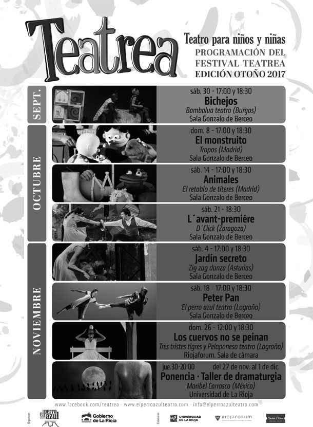 Teatrea, el festival de teatro infantil organizado por la compañía ‘El Perro Azul? y el Gobierno de La Rioja, con la colaboración de la Universidad de La Rioja (UR), se desarrollará desde el sábado 30 de septiembre y hasta el próximo 26 de noviembre con una variada programación que incluirá siete representaciones teatrales en dos escenarios diferentes: la sala Gonzalo de Berceo y Riojaforum.