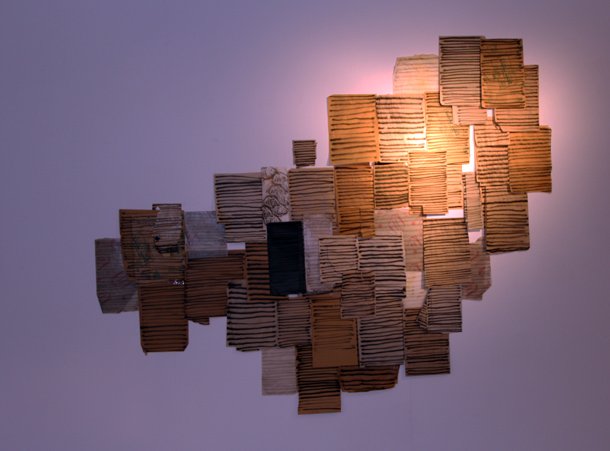 -'Flúor' (2016. Listones de madera, resina de poliuretano, pintura fluorescente y cuerda entorchada).