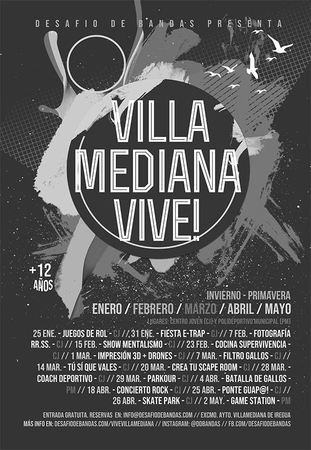 ‘Vive Villamediana’ inaugura el programa 2020 el próximo sábado, 25 de enero, con la celebración de las partidas de Juegos de Rol. La primera cita con la música será la semana siguiente, el viernes, 31 de enero, con la Fiesta E-Trap, que contará con artistas, Dj’s y Baile Show. Febrero comenzará con ‘Fotografía y redes sociales’, abordando uno de los espacios que más interés despierta en los jóvenes. La entrada es gratuita en todas las actividades hasta completar los aforos previstos; la reserva de plazas puede realizarse en info@desafiodebandas.com