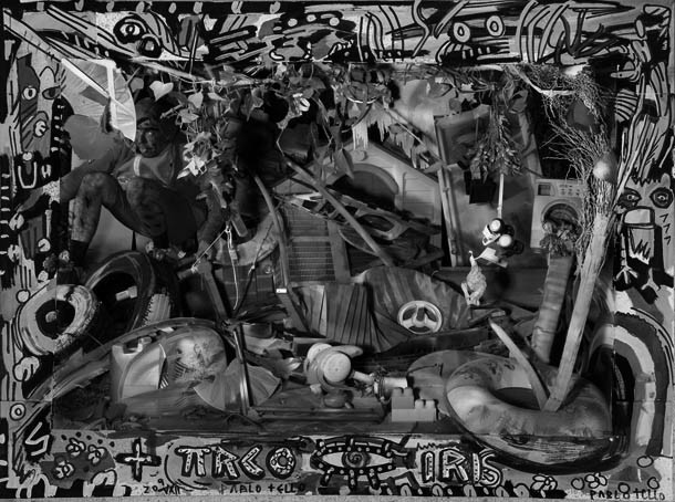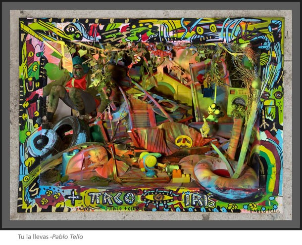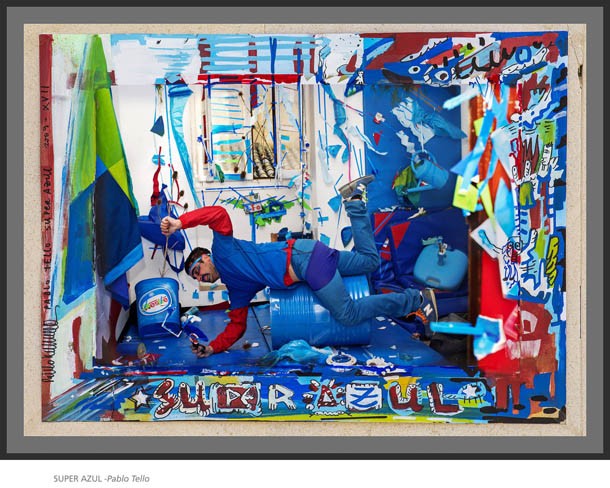 Pablo, por su parte, pintor en otro tiempo, practica una fotografía incendiaria en la que no quedan espacios para el consuelo. Cada obra de Pablo Tello es una escenografía teatral en la que cada objeto es simbólico, incluso el mismo autor aparece sumergido en un universo que trata de explicar el mundo por la lucha de contrarios.