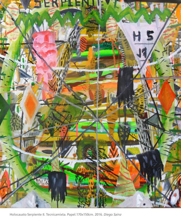 La pintura de Diego es libertad en estado puro, "con un trasfondo de alegría y azar". Su pincel navega sobre el lienzo virgen "en busca de un itinerario mental en el que aflora el autor de una manera explosiva". Colores, figuras y frases superpuestas invitan a descubrir a golpe de machete la selva cromática que plantea el autor en aras de compartir su espacio de libertad.