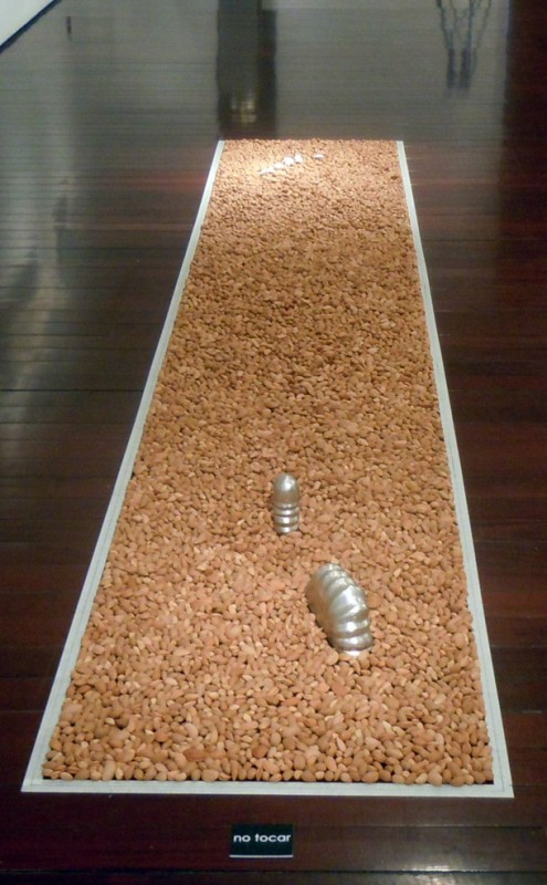 Una base rectangular de almendrucos sorprende al acceder a la Sala de Exposiciones de la Fundación Caja Rioja. “Es una metáfora social”, apunta su creador, el escultor Carlos Díez Crespo ‘Mochuelo’. “Se denomina ‘Entorni’ –describe- y como digo, es una metáfora social. El conjunto de almendrucos todos juntos, todos iguales pero diferentes, con algunos que se salen de esa uniformidad y representados en otro color, y el poder vigilante, pendiente de observar quién se mueve”.