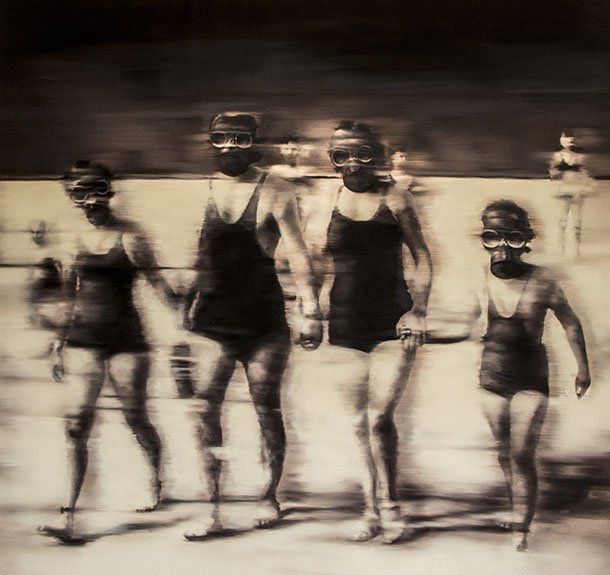 Frente a ‘Nuclear Family’ la obra ganadora del certamen resulta inquietante. Sobre el lienzo una familiar en bañador camina sobre la playa de la mano. Parecen aproximarse a la orilla del mar. Parecen disponerse a disfrutar de las olas durante un día de vacaciones. Desconcierta que los cuatro cubran sus caras con máscaras antigás. “Estoy de acuerdo -resalta Tornero-, la obra resulta inquietante. Forma parte de un proyecto más amplio en el que abordo imágenes que tienen su referencia en el periodo entreguerras. Me planteo la relación asumida de que aprendemos de forma lineal, pero lo cierto es que sabemos, porque la historia así lo muestra, es que existe el miedo, las preocupaciones, la alegría; sabemos que la vida no es lineal, existen los ciclos”.