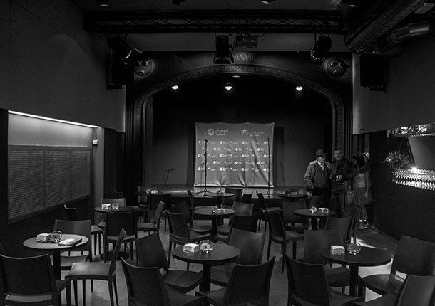 Dejamos el área formativa y nos adentramos en Sala Negra. La atmósfera recuerda al espacio destinado al público a un club de jazz americano con mesas redondas levemente iluminadas, mientras el escenario alude al teatro clásico, a un joven Shakespeare poniendo en marcha su sueño de una noche de verano. Cuenta Alejandro que “la Sala Negra nace con la idea de mostrar propuestas teatrales que veía que se ofrecían en otras ciudades y en La Rioja no existía un lugar donde representarlas. Hablo de espectáculos teatrales alternativos y específicos para este tipo de salas. Existe algo similar que es la Salón de Columnas del teatro Bretón, pero que no tiene mucho uso. Sala Negra nace con el objetivo de ofrecer alternativas de ocio y cultura”. El programa que hemos diseñado para Sala Negra es proyectar cine en versión original los lunes -un ciclo iniciado con ‘las odiosas ocho’, las películas de Tarantino-; los martes y los miércoles están reservados a cualquier persona amateur que desee poner en escena teatro u otra arte escénica; los jueves sonará en la sala jazz y soul. “Hemos elegido esos géneros esencialmente por dos cuestiones; una por que me gustan a mí -se ríe- y otra porque el resto de conciertos de otros ámbitos están perfectamente cubiertos por otras salas como el Biribay, por ejemplo. Además, el espacio de alguna manera lo pide, pide esa música”. Los viernes por la tarde es el turno para el teatro de corte dramático, “mientras que para las noches de los viernes hemos creado las ‘Actuaciones Canalla’, en las presentamos a monologuistas, cabaret, etc”. Sala Negra destina los sábados a primera hora al público infantil y familiar, actividad que regresa el domingo por la mañana. Sábados y domingos por la tarde, al escenario regresa el teatro. “La Sala Negra no cierra ningún día”.