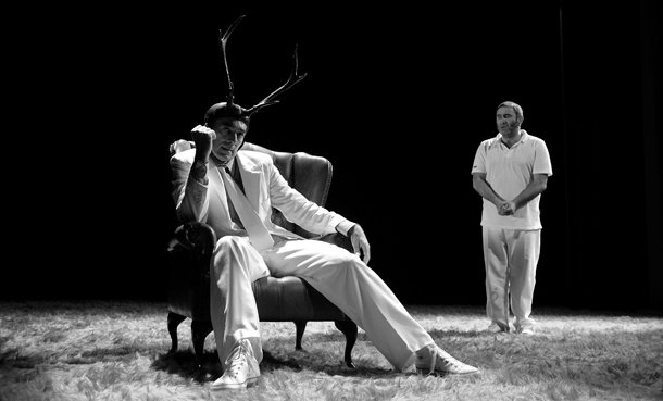 Es una obra de teatro de creación, la hemos escrito nosotros –Jorge Picó y yo- y es, se puede decir, una comedia. Es decir, el humor es la única manera de enlazar la antropología con el tenis. Es una manera también de despistar, ya que es un espectáculo que es muy fácil de ver, pero resulta mucho más difícil de explicar. Tiene un tono un tanto surrealista. Es la historia de un señor, al que yo interpreto, que no se calla ni debajo del agua y que se marcha en busca de un sitio mejor, de un paraíso. Se encuentra con una especie de animal, una especia de ser con cuernos. Nos pasamos la obra preguntándonos si se trata de animal, de un dios, de un ciervo o, simplemente, de un gilipollas que se ha puesto unos cuernos en la cabeza y trata de embaucarnos. Es el encuentro entre dos personajes, uno que no se calla y otro que no dice palabra alguna, que habla mucho pero a través del gesto, del cuerpo.