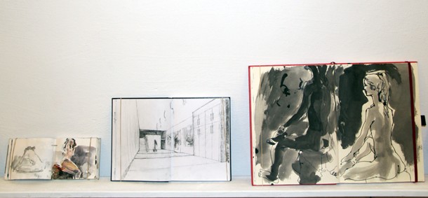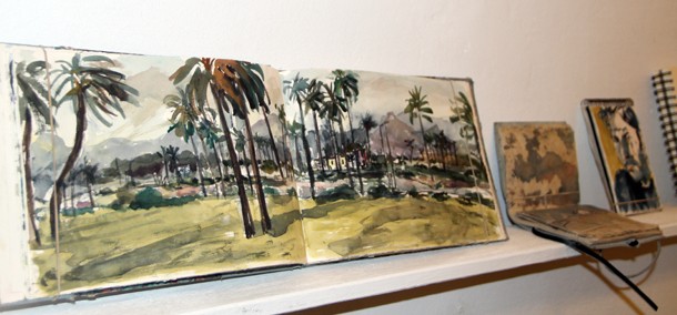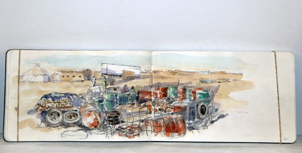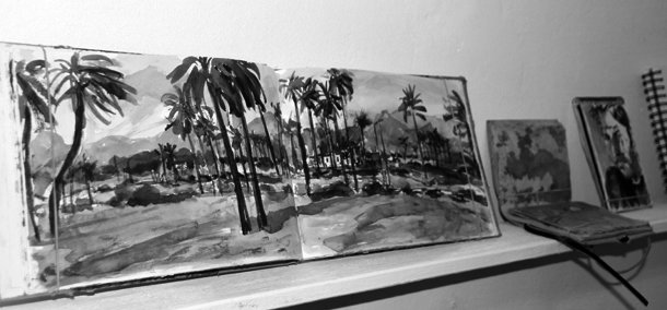 La conversación continúa junto a tres cuadernos que guardan cierta similitud de estilo y temática. “Pasé un mes en los campamentos de Tinduf en el Sáhara. Fue un mes de convivencia con las personas que viven allí en los que quería mostrar lo que había de bonito en aquel lugar. Aquellos cuadernos dieron lugar a un libro cuyos beneficios han sido destinados al Sáhara”.