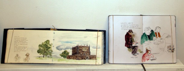 Entre los dibujos de Javier resaltan también las temáticas urbanas –urban sketchers- e incluso un ‘reportaje’ sobre el festival Pirineos Sur. La mayoría de los cuadernos que pueden contemplarse en La Lonja han sido confeccionados in situ, “tan sólo un par de ellos han surgido desde fotografías”. Las acuarelas son la técnica más utilizada por De Blas, aunque también pueden encontrarse obras en las que los lápices o incluso el bolígrafo son protagonistas. Javier disfruta experimentando y con los efectos que descubre al combinar diferentes tipos de papel con distintas tintas y pinturas. A la pregunta sobre si el dibujante de cuadernos tiene alma de escritor no duda y responde afirmativamente. “Están muy cerca; al revés creo que también sucede. En mi caso no encuentro dificultad para escribir”. Quizá da igual el camino, se trata de contar historias, de contar lo vivido./Javi Muro