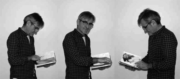 De Blas sostiene en sus manos uno de los cuadernos, lo abre y pasa sus páginas con mimo, con delicadeza, precavido ante la posibilidad de que un movimiento brusco pudiera provocar el desprendimiento de los instantes retratados.