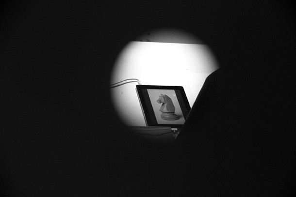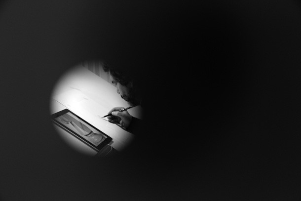 Las miradas se acumulan a través de agujeros que a diferentes alturas salpican las paredes del provisional estudio de ‘Curioseando Artistas’. Rosales se siente a gusto. “Era algo –indica- que ya me había planteado en alguna ocasión y cuando me lo planteó Marina no lo dudé. Coincido totalmente con el planteamiento que ha realizado en la propuesta, que está perfectamente definida sobre la idea de acercarse y observar al artista en pleno proceso creativo”. Para Carlos Rosales, iniciativas cómo ‘Curioseando Artistas’ son fundamentales: “Hacemos cosas, pero la gente no sabe cómo”. Si nos atenemos de nuevo a las piezas que acompañan el encierro del artista, el proceso quizá tenga algo de alquimia. Una piedra de oro así parece querer explicarlo. “No somos magos –dice-, pero es cierto que en el estudio de los artistas se produce algo parecido a la magia. Hay una lucha titánica contra los propios materiales y la imagen”. Mientras dibuja, dos caballos de ajedrez enfrentados y un reloj medidor de partidas le escoltan. “Marina me ha regalado tiempo –recuerda- y ahora tengo que ver cómo lo utilizo, qué hago con él”. ¿Y los caballos?... “Es la figura más bonita, la que tiene un movimiento más bonito”… el concepto, pero también la estética, la belleza…/Javi Muro