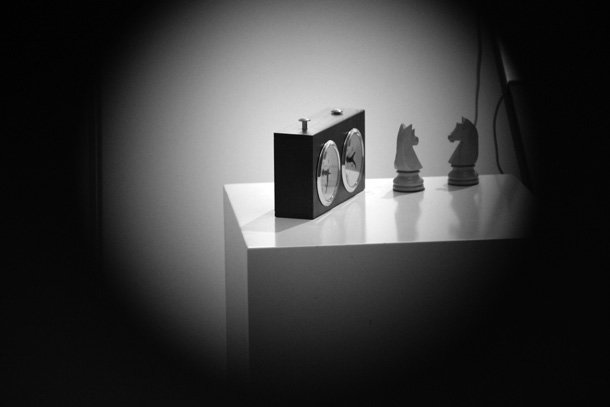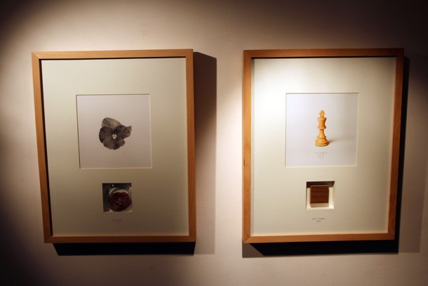“Quería realizar un estudio –describe- sobre donde acaba la realidad y comienza otra distinta; sobre la forma en que tratamos entendernos y explicarnos. Hay un tiempo interior, dentro del estudio en el que trabajo, y otro exterior, el que se desarrolla fuera”. Para explicarse, acude al ejemplo de algunas de las obras que le rodean. Una vitrina enmarcada muestra la fotografía de una figura de ajedrez, un rey, y justo debajo, la tablilla de madera que representa la casilla del tablero que ocuparía. “Hablo –detalla- de la idea de durar; la fotografía en papel del rey no va a durar, sólo quedará la casilla, el lugar que ocupaba en el tablero. La figura desaparece, pero el lugar permanece”. La barca y el río.