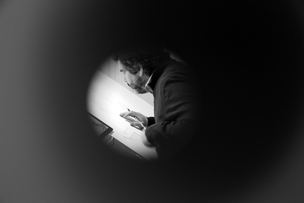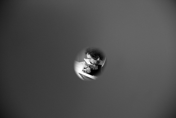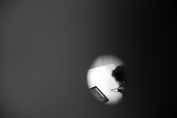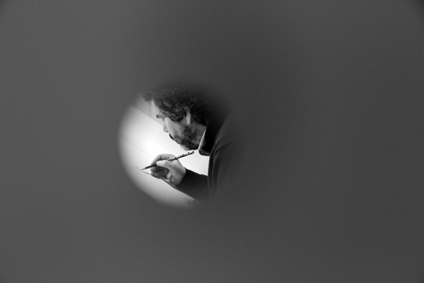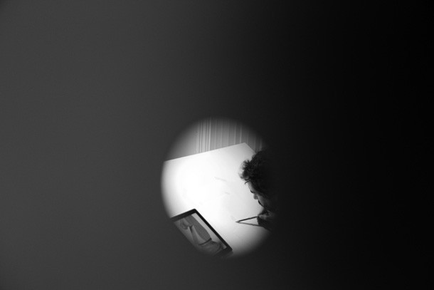 Recuerda un proverbio –tal vez fuera chino- que la barca pasa pero el río queda. En el interior del estudio en miniatura, recorrido por múltiples mirillas por sus paredes, Carlos Rosales habla de Camus. Una reflexión del escritor y filósofo acompaña su encierro voluntario en la gran caja blanca que PeepArt Project ha denominado ‘Curioseando Artistas’ y que dentro del programa del festival persigue acercar los procesos creativos de los artistas a la gente. En la liberta abierta junto a la mesa de dibujo puede leerse: “…donde la tierra acaba… y el mar comienza…”.