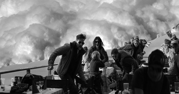 Pero estos fenomenales rasgos estilísticos y la intensa narrativa formal construyen una historia donde los personajes no destacan por su profundidad. Cuando miramos más de cerca, el argumento parece trenzado con estándares familiares que empobrecen las posibilidades que prometía estéticamente. Resulta que la naturaleza domesticada no es solo la de las montañas. El protagonista masculino aparece como un padre de familia típico, frustrado por unas responsabilidades y limitaciones que se desvelan durante el metraje alienantes, desubicado por no dar rienda suelta a sus deseos y sus impulsos de hombretón, avergonzado por ―como el propio personaje declara― padecer una especie de doble personalidad que le lleva de vez en cuando a actuar por impulsos, como la nieve de las montañas se revuelve contra la doma y se desparrama en avalancha. La mujer-madre, preservadora de los valores familiares, neurótica y frustrada, insoportable en su pretensión de que su compañero sea consciente de sus fallos, sonsacándole para que admita su cobardía en público, propiciando el desalojo de un autobús porque se mueve más de la cuenta en una carreterucha de montaña. Vaya, esto ya no suena a un moderno núcleo familiar en la república independiente de su casa, sino a un conflicto muy tradicional, eso sí, muy bien encuadrado por vigas de madera y moqueta de lujo en un hotelazo donde todos los miembros de este anuncio de Coca-cola deben estar obligatoriamente metidos en una habitación que sustituye pobremente al hogar.