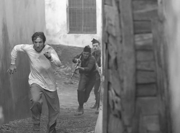 ‘La Trinchera Infinita’ nace alejada de ideologías y, muy lejos de posicionarse, acierta en centrarse en las sensaciones por las que navega nuestro protagonista. La película arranca, poderosa y llena de sorpresas, obligando al espectador a vivir la intensidad y el terror que golpean a Higinio. Como en las grandes producciones de acción, el sonido juega un enorme baza a la hora de hacernos vivir la experiencia del protagonista, caminamos con él, sentimos el dolor de sus caídas, de sus heridas y sobresaltos en una fusión necesaria aunque molesta. La cámara no da tregua y vivimos la intensidad en cada detalle, en cada huída, en cada respiración con el único objetivo de zafarnos de nuestros perseguidores, de salvar la vida, de seguir adelante.