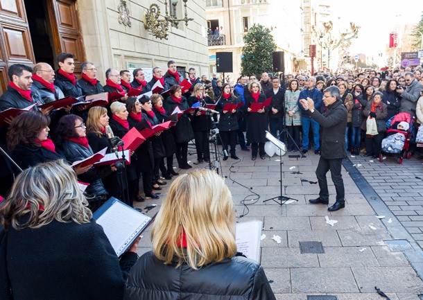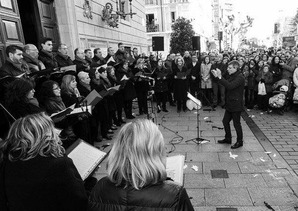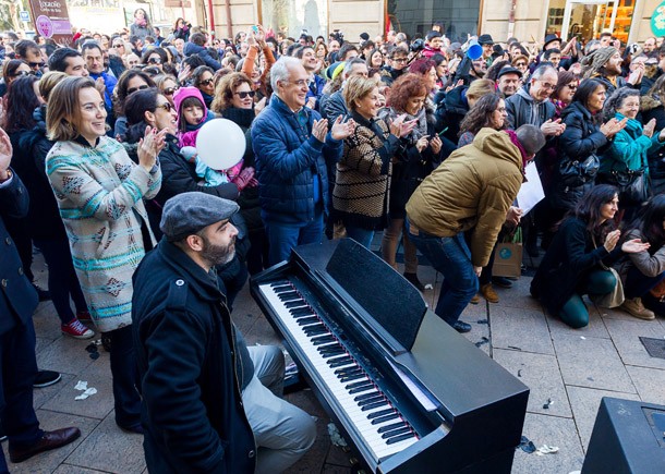 Desde una escalinata situada en la intersección entre calles, se recordaba que contemporáneo incluye todo lo creado desde el siglo XIX, mientras que desde los balcones se rebatía dicha apreciación y se solicitaba una mayor amplitud de miras. Al tema rap interpretado por Martín Ramonda, respondía una versión del Canon de Pachelbel. El aplauso general no escondía el recuerdo de que hoy el mundo se mueve muy deprisa, por un grupo de actores intercalados entre el público, que portaban una pancarta donde se podía leer: “La cultura es un arma cargada de futuro” y la demanda de rebaja del IVA Cultural.