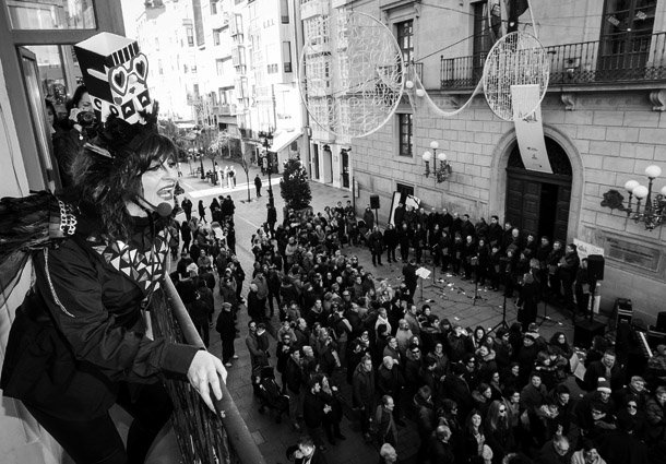Todo comenzó con un funeral y al ritmo de Semana Santa que imprimían los tambores que acompañaban el féretro. No hubo desgracias que lamentar, el finado era ya conocido por todos y hacía cuarenta y ocho horas que nos había dejado. Olvidamos rápido. Así que despedido 2015, actores y el público reunido no dudaron en gritar al unísono por el nuevo rey ¡Viva Actual 2016! Grito multitudinario acompañado de la suelta de globos blancos y negros, en referencia a lo que se va y lo que viene.