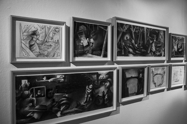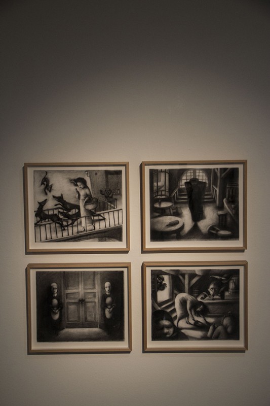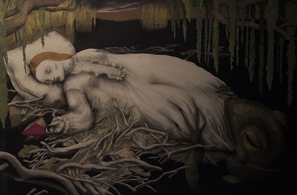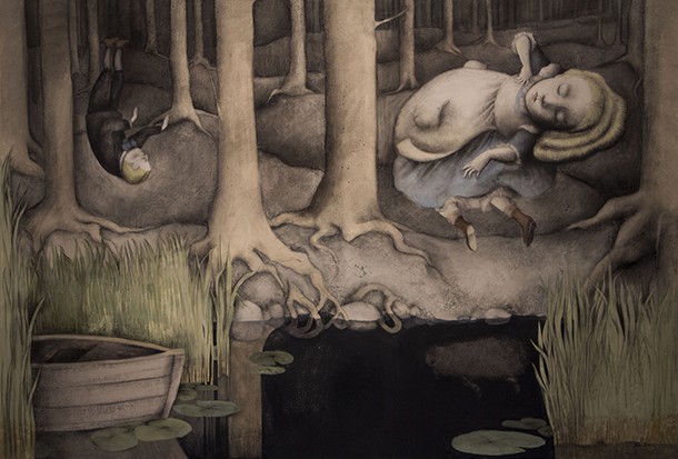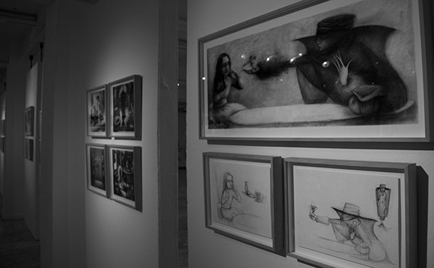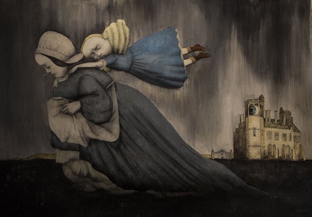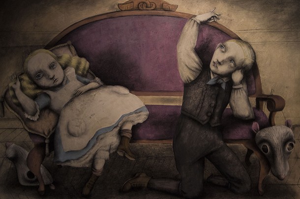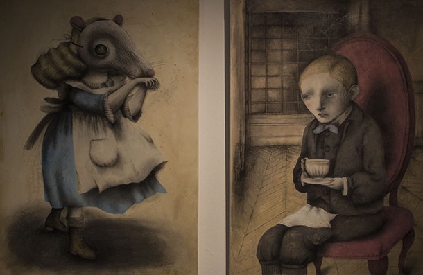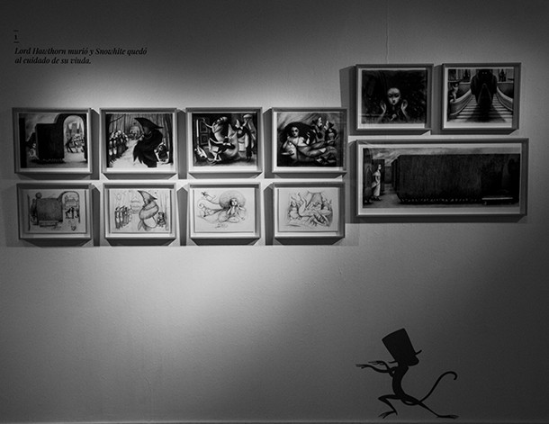 Al otro lado está la imaginación, la fantasía, los acontecimientos extraordinarios. Al otro lado, de tiempo en tiempo, cruzan personas con talentos portentosos que a su regreso cuentan historias fabulosas de forma sorprendente. Hay quien al puente entre una y otra dimensión narrativa lo denominó madriguera y creo un país de las maravillas. Hay quién para contar, ya sea con palabras o lapiceros y pinceles, tan sólo atraviesa el umbral de una puerta. Una puerta que no se abre a cualquiera. Es preciso contar con una sensibilidad especial para relatar, para ilusionar a través de la propia imaginación y despertar la del otro; para al enlazar las palabras, trazar dibujos, crear ilustraciones, dar color o difuminar carboncillos surja la magia de las buenas historias. Al adentrarse en la Sala de Exposiciones de la Escuela de Diseño de La Rioja (ESDIR) la magia se siente al instante. Las ilustraciones de Ana Juan llaman al visitante desde todos y cada unos de los rincones, dirías que están en conexión unas con otras con independencia de que pertenezcan a relatos diferentes. Los personajes de ‘Otra vuelta de tuerca’ -la novela de Henry James- y los de Snow White -Blancanieves- conviven en complicidad, parecen decirse unos a otros: “¡Ei! Un nuevo visitante. ¡Qué sienta la magia!