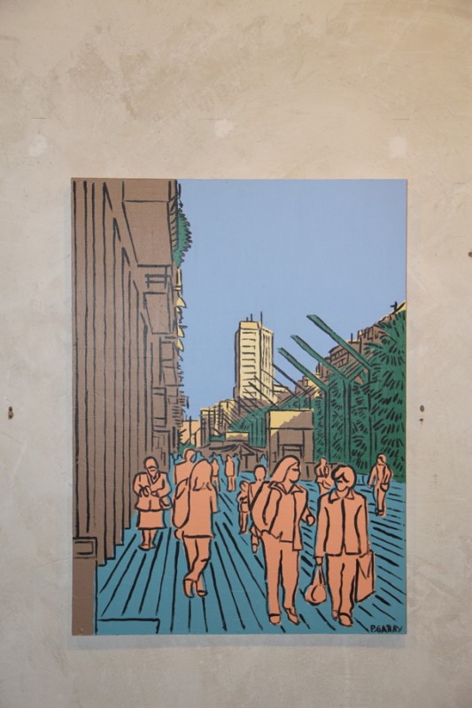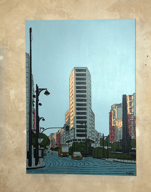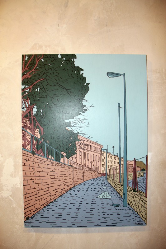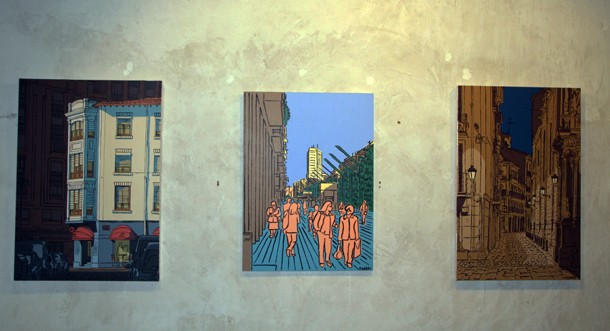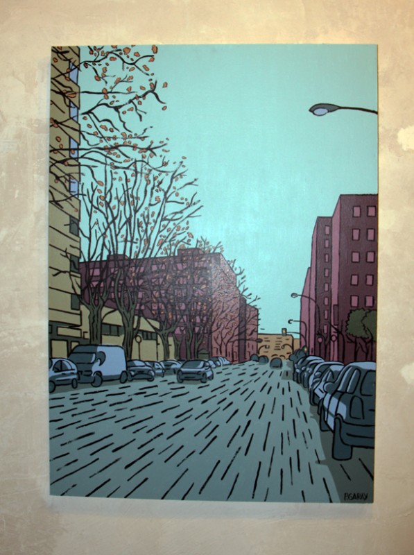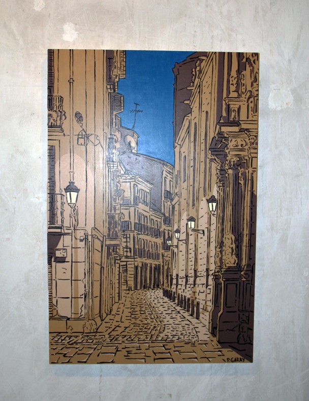 Cuentan José Miguel y Aurora León que un día Pablo Garay se acercó a la Sala de Exposiciones Planta Baja y les mostró un portafolio con su trabajo como dibujante e ilustrador. Los responsables del espacio cultural logroñés, ambos arquitectos de profesión, conectaron de inmediato con una pintura en la que resaltaba una mirada urbana. “Logroño –recuerdan en el catálogo de la exposición- en las imágenes de Pablo, parecía estar presto a ser el fondo de todo tipo de aventuras ilustradas pertenecientes a un género cultural que ha sido reconocido como el ‘noveno arte’. Y es que nadie debe extrañarse si al acceder a Planta Baja tiene la sensación de que Tintín y Milú van a aparecer corriendo por el callejón que discurre junto a la vía del tren enlazando las calles Vara de Rey y República Argentina de la capital riojana.