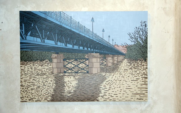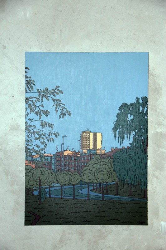El catálogo de ‘Paisajes Urbanos’ apunta como, de forma aislada, una mancha de color o una línea imprecisa son elementos sin apenas significado. Esto cambia cuando tales elementos son yuxtapuestos a otros similares de forma coherente con un código. Mediante dicho código podemos sintetizar una imagen compleja de 256 colores usando sólo 5, 8 o 10 tonos apoyados por líneas. La imagen resultante evoca de forma efectiva a la que me sirve de referente. “El uso del color afecta mucho –reivindica Pablo Garay- y me he propuesto guardar una proporción. Igual que el fotómetro en una cámara de fotos te indica que hay una relación entre diafragma y obturador, en las imágenes que percibimos también se da siempre una relación entre un color y otro, una relación de complementariedad. Es decir, tú puedes exagerar, por ejemplo, el color dominante del río cuando baja sucio en invierno y empujarlo hacia el marrón. Si te basas en la armonía de colores lo que rodea a ese río marrón tiene que ser de su color complementario. Creo que mantener siempre esa relación es lo que permite que puedas identificar”.
