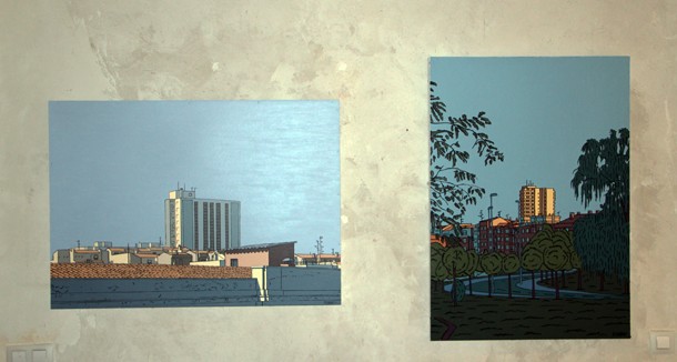 Garay –resaltan José Miguel y Aurora León- dibuja la ciudad voluntariosamente sin protagonistas humanos, casi sin vecinos, haciendo de los edificios y de los vacíos entre ellos los actores principales de una atmósfera urbana, de la que habitualmente, estando tan próxima, no somos conscientes o no reparamos en ella. “Es cierto –reconoce el artista- es que las personas no son protagonistas, pero no es algo buscado. No busco quitar a las personas del entorno, pero lo que me llama la atención es una fachada iluminada o la geografía urbana con sus efectos lumínicos y ahí el ser humano tiene poca cabida. Más que nada por una cuestión de escala. En otras series de trabajos sí que el personaje humano está presente”.