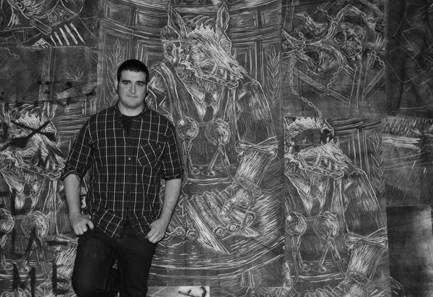 Carlos Ramírez (Logroño, 1987) presenta una única obra realizada ex profeso para ‘Los días más hermosos’. Se trata de un gran mural titulado ‘Balada de consentimiento a este mundo’, consistente que muestra a través de doce planchas xilográficas, talladas con gubia sobre DM, y estampadas a mano con tinta negra sobre algodón crudo sin tratar. Posteriormente, Carlos ha intervenido sobre las estampaciones con distintos tratamientos pictóricos, desde tinta a disolventes, originando monotipos que, a su vez, se suman en capas a la obra inicial, interfiriendo unas con otras, conformando visualmente un muro de aproximadamente 12metros de largo por 6 de ancho. “Comencé a realizar el mural en casa, en el piso que comparto con unos amigos. Ha sido una obra acumulativa que terminó convirtiendo la casa en algo parecido a una imprenta. Llegué a contar 180 metros de tela y el piso se quedó pequeño y finalmente terminé el mural en la propia sala”.