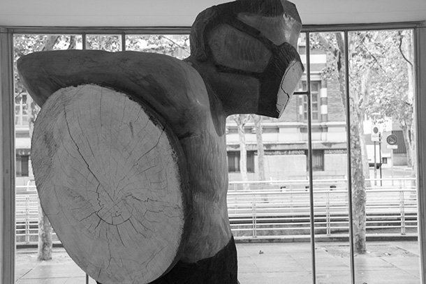 'Más allá de mis pies' reune en la Sala de Exposiciones del Ayuntamiento una selección de esculturas procedentes de la colección Artium. La muestra propone un recorrido a través de 22 piezas que llevan la firma de Francisco Leiro, Javier Pérez, José Ramón Amondarain, Juna Luis Moraza, Ibon Aranberri, Manuel Sainz, Jaume Plensa, Ana Laura Alaez, Jacobo Castellano, Susana Solano, Alberto Peral, Jorge Oteiza, Asier Mendizabal, Carlos Schwartz, Bene Bergado, Erick Beltrán, Ulrich Vogl, Elena Asins, Santiago Serra, Sergi Prego, Shilpa Gupta, Alicia Mihai Gazcue, Txuspo Poyo y Txaro Arrázola. El título, 'Más allá de mis pies', “nos habla -describe el catálogo- de ese espacio próximo que ya no nos es propio. Del límite, como lugar de intercambio. Estas obras nos sitúan en el límite, no como barrera, como lugar de ruptura, sino como espacio en el que confluye lo que conocemos, el espacio del pacto, el convenio con los demás, con el lugar donde terminan mis pies, y se empaña la lenguaje”.