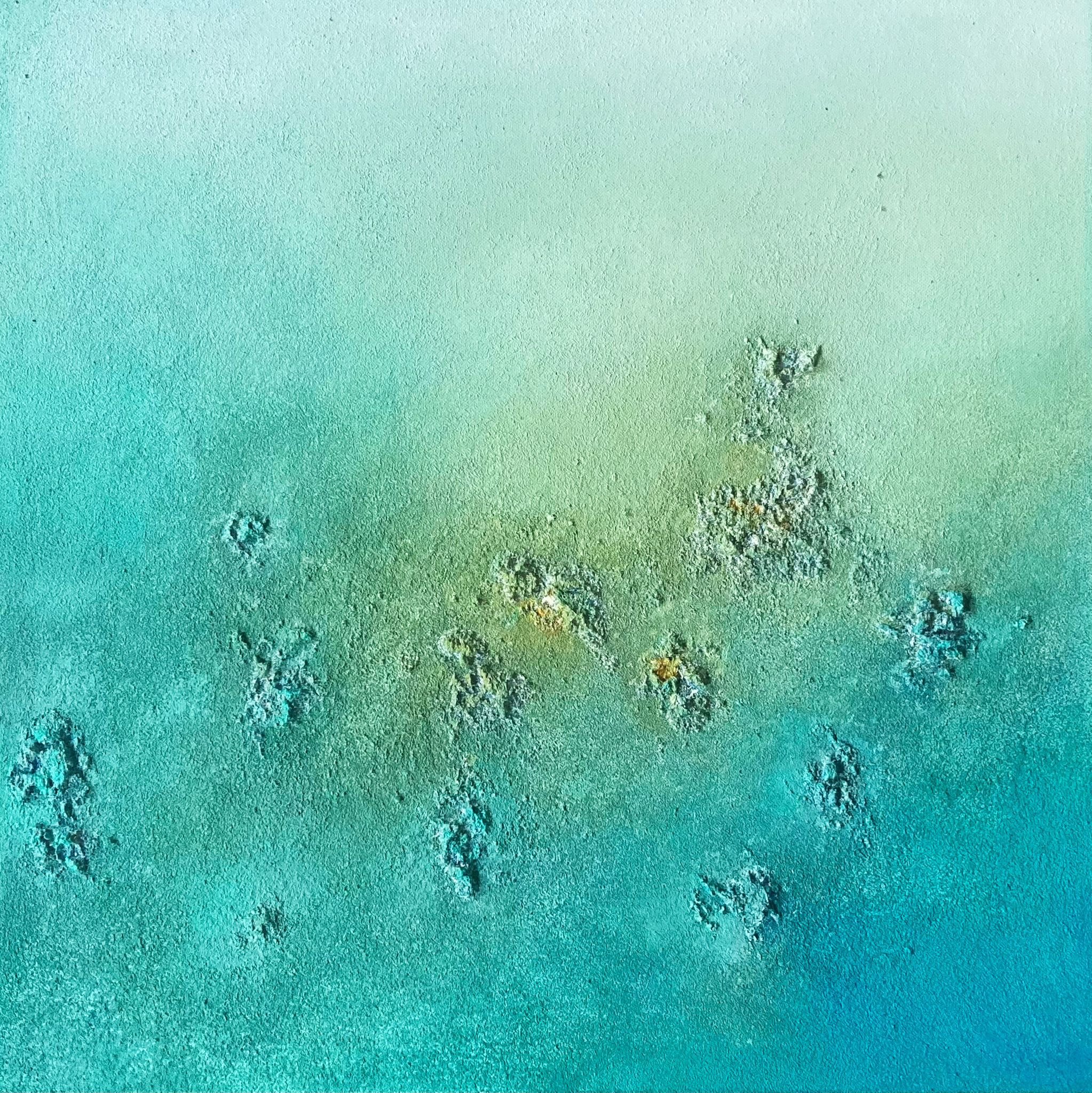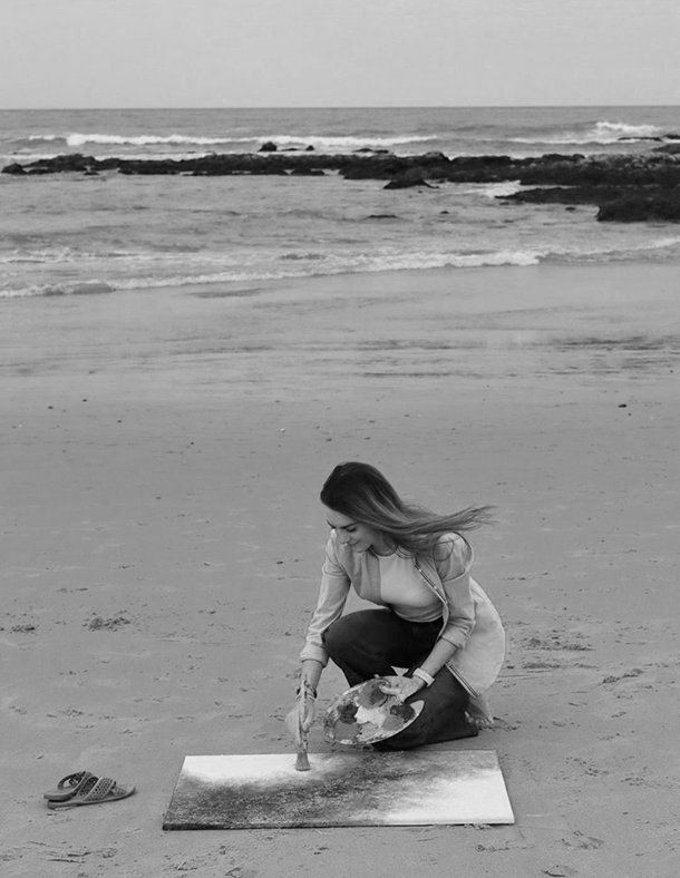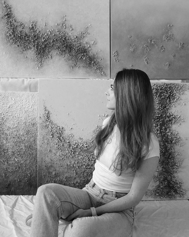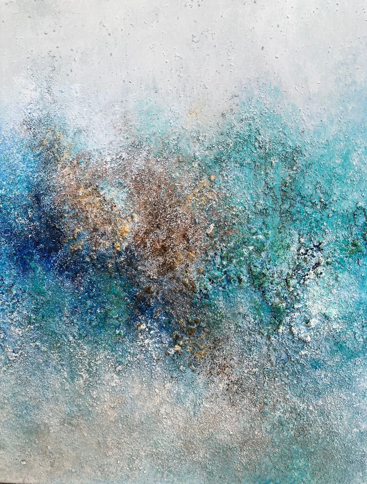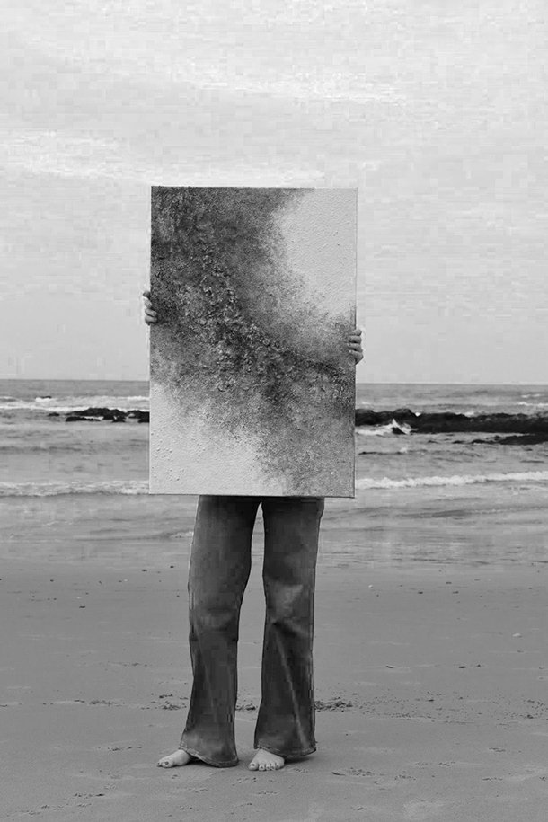 Para dar forma a las texturas que protagonizan su pintura, Andrea utiliza arenas de playa. “Dispongo de diferentes tipos, finas, gruesas -principalmente del norte- e intermedias, y siempre de playas que permiten coger esa arena. También empleo piedrecitas, polvo de mármol, yeso y geso, una combinación de cola y pintura blanca”. La artista recuerda que “han sido dos años investigando con diferentes materiales, también para la preparación previa del lienzo, probando y probando, experimentando hasta lograr el resultado que buscaba”.