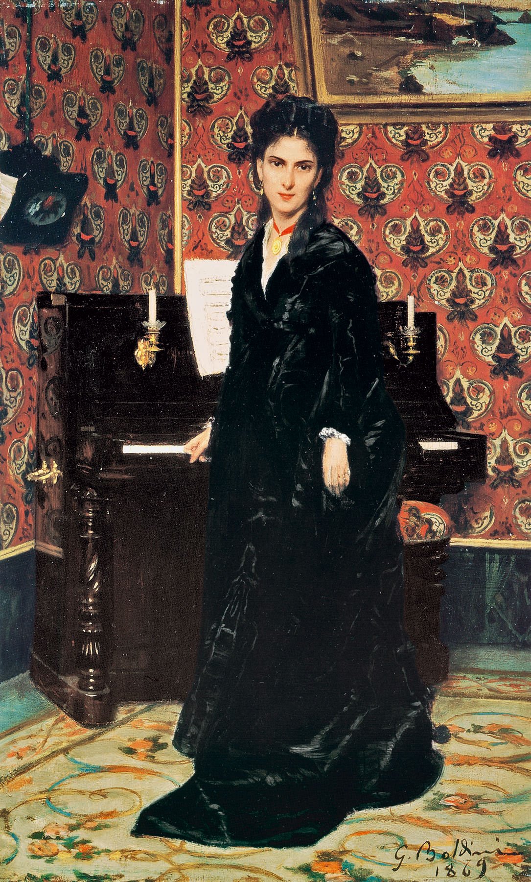 A su llegada a París en 1871, tras haber trabajado junto a los Macchiaioli en sus primeros años florentinos, Boldini se dedica a los 'cuadros a la moda', que, "de inspiración fortunianan, hacen las delicias de coleccionistas y marchantes. Se trata de 'cuadritos' de mediano o pequeño formato, a menudo de espíritu dieciochesco, que narran historias sencillas y anecdóticas fácilmente comprensibles para el público, que los colecciona con profusión. Raimundo de Madrazo recoge en París, el testigo de este tipo de escenas tras la marcha de Fortuny a Roma y Boldini entra pronto en contacto con el pintor español y su círculo, como se puede apreciar en El mantón rojo, del propio Boldini, o en algunas de las escenas de calle del catalán Román Ribera, que en época reciente han sido incluso confundidas con las del pintor italiano".