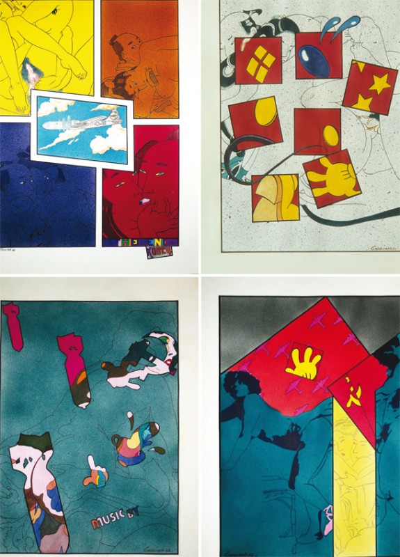 En los primeros años de los ochenta -en el conjunto que se exhibe en la Twin Gallery- Carruana reitera con mayor énfasis fragmentos de máquinas bélicas y aviones de combate que ya asomaban tímidamente en momentos anteriores de su trabajo, tanto en pintura como en el cine de animación. Incluso, en una de estas piezas, el creador se apropia, a través de una cita directa, de la histórica fotografía documental donde se ve a la tripulación del bombardero bautizado como Enola Gay que lanzó la bomba atómica sobre Hiroshima el 6 de agosto de 1945./Javi Muro