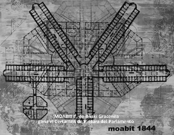 ‘MOABIT I’ forma parte de una serie de obras de arte –pinturas y objetos- que reflexionan sobre la violencia pasiva y activa, el individuo el grupo, la vigilancia y la pérdida de derechos. Son cuadros –como la pintura ganadora- bajo relieves, estructuras y grabados que juegan con la confrontación entre los símbolos y lo que representan para la sociedad y su extrapolación artística que los muestra también desde la belleza de la creatividad. ‘MOABIT I’ es una de las obras en las que Gracenea recrea diferentes prisiones construidas en el siglo XIX. En el cuadro ganador del certamen, el artista juega con el blanco y negro y las plantas en superficie de los edificios carcelarios a diferente intensidad para crear una nueva figura; un laberinto de pasillos, celdas, escaleras y estancias que parecen invitar quien los observa a mirar al fondo. Quizá, a bucear en el propio debate que plantea Iñaki Gracenea.