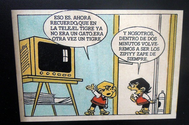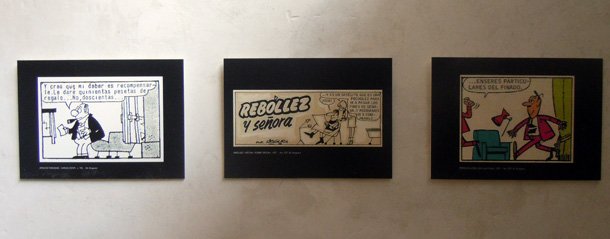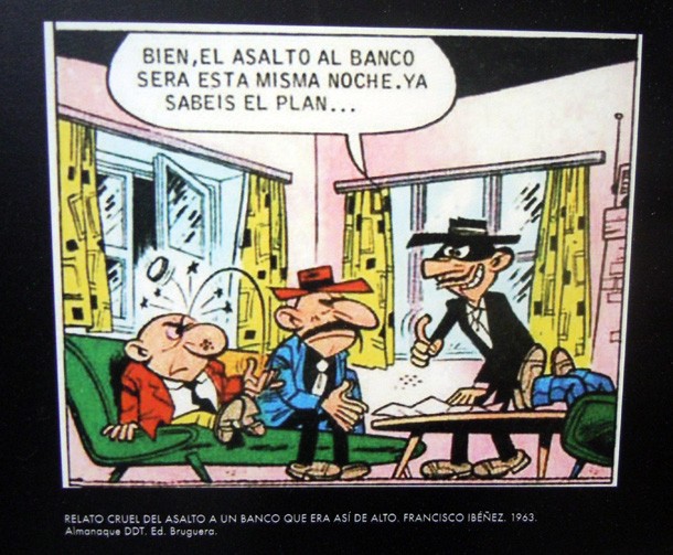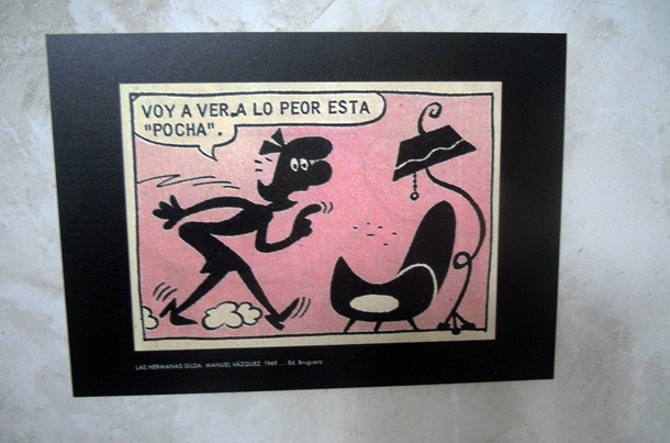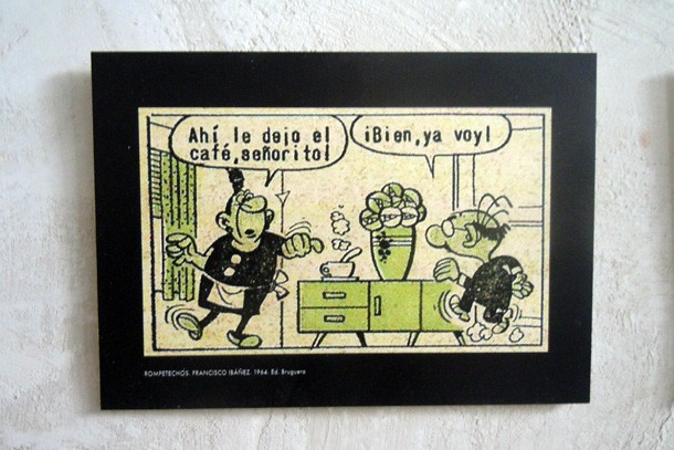 El mobiliario cuenta en ‘Muebles de ayer y de hoy’ con un complemento extraordinario en las viñetas de la época. Ilustraciones firmadas por Vázquez, Ibáñez, Escobar, Conti o Herge, en las que se observa como emplean las sillas, armarios, mesas, butacas o lámparas de moda en esos años para dar contenido a sus historietas y cómics.