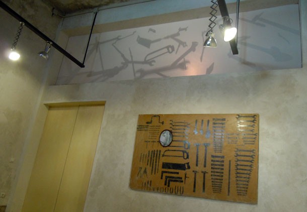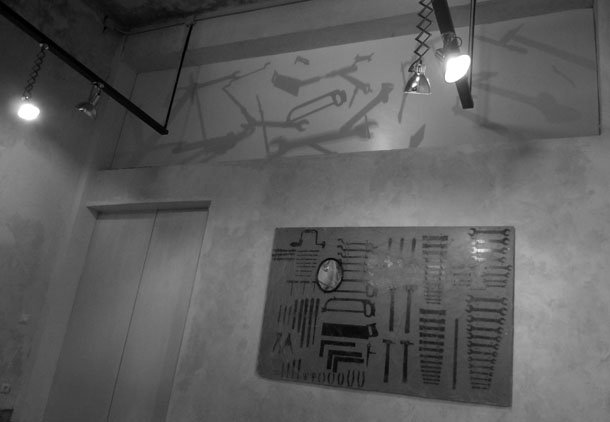A tan sólo unos metros, la instalación propuesta por Demetrio Navaridas se organiza a dos niveles diferentes, física y conceptualmente. “En el inferior, en el terrenal –detalla- podemos observar, bajo la iluminación del espacio expositivo, un cuadro que muestra las herramientas que reinaron en un uso anterior y que el desuso ha bañado de polvo y telarañas. La composición tan sólo conserva como signo vital, un espejo, a través del que se refleja el ojo de buey que contempla la puerta de acceso a la sala de exposiciones”.