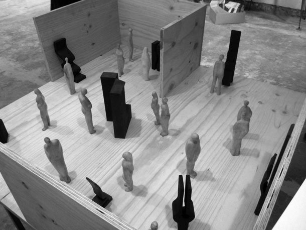 Para responder a José Miguel y Aurora, Reyes recurrió a un trabajo ya iniciado en el que representaba la vida de un barrio, en el que –en otras cosas- había una sala de exposiciones. “Las figuras de los amigos –explica- contrastan con las esculturas abstractas que están expuestas y que pueden cambiar como sucede en una sala real, invitando a otros artistas a participar”. En definitiva, dice, “como es tradicional en mí, cuento cosas que he vivido y que me dejan huella”.
