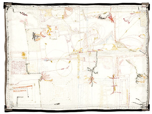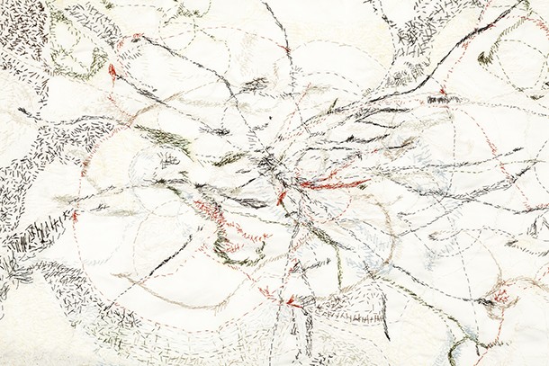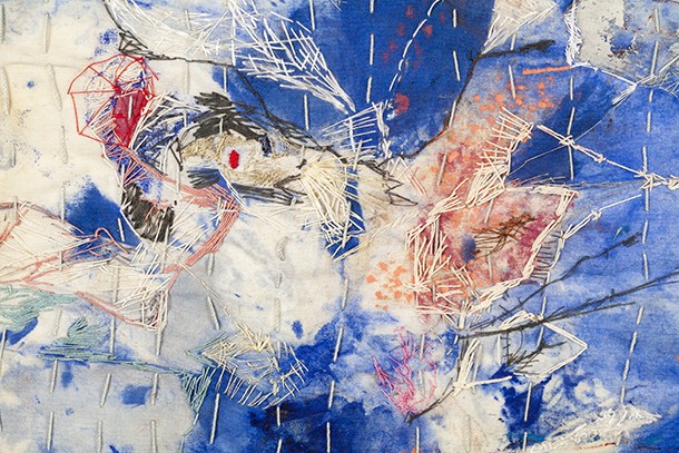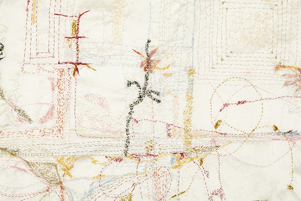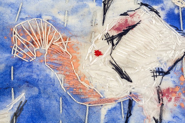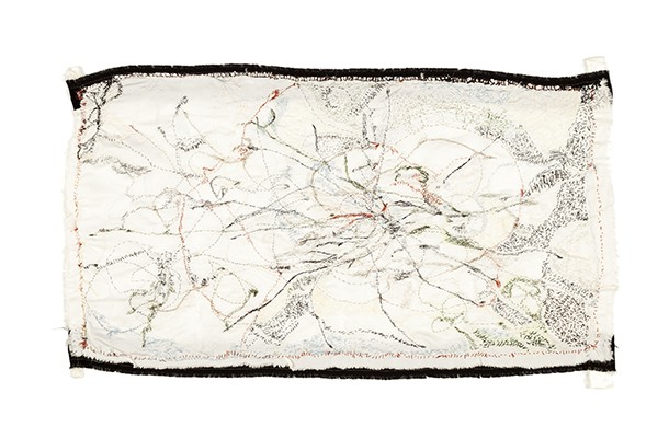 La colección de obras que acoge, desde el viernes 27 de abril y hasta el 31 de mayo, el Museo del Torreón tiene su origen en 2017, cuando la artista inicia una etapa vital radicalmente distinta, “A pesar de lo cual -tal y como recoge el catálogo de la muestra- mantiene la idea de transitoriedad que constantemente refleja su vida nómada, cuyo final no se aventura próximo”. El material con el que están confeccionadas sus obras es la tela y el hilo, principalmente la seda y el algodón, “con el que traza un pausado recorrido a través de la costura considerado un medio romántico, misterioso, reservado y melancólico”. De alguna manera, son dibujos abstractos que deambulan por la tela, “como quien, sin rumbo fijo, recorre el espacio por el simple hecho de caminar”.