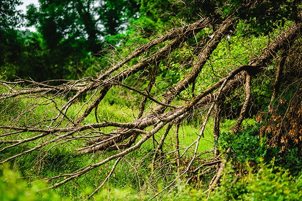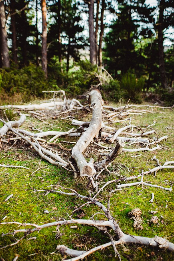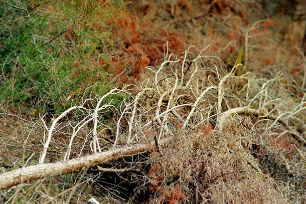 Algo así ocurre al contemplar estas fotografías, en las cuales subyace una intención reivindicativa: una denuncia sobre la desaparición de los bosques y los hábitats de los animales, de la aparición de basuras generadas por el ser humano y, en definitiva, de nuestras irresponsables y constantes acciones sobre estos. La nostalgia se deja entrever en estos retratos. Árboles mutilados. Troncos cortados y pelados que posan en medio del paisaje como si de esqueletos esparcidos se tratara. Árboles caídos o cortados que descansan inertes sobre la tierra…