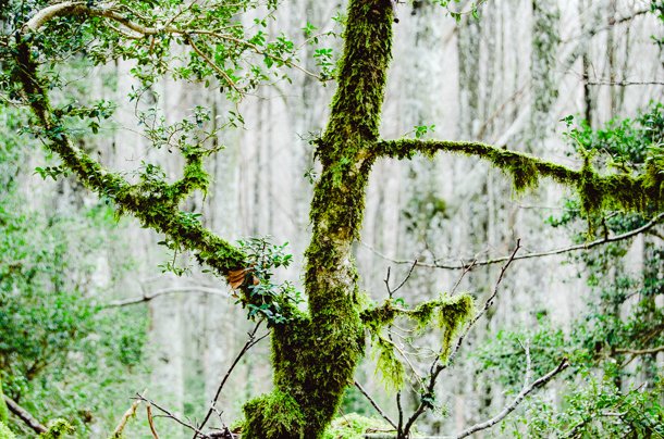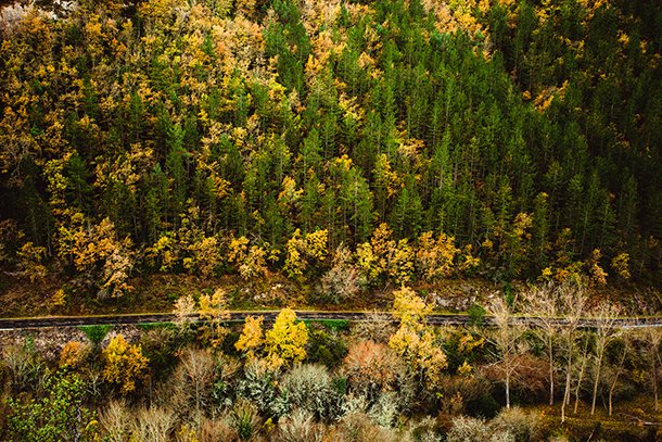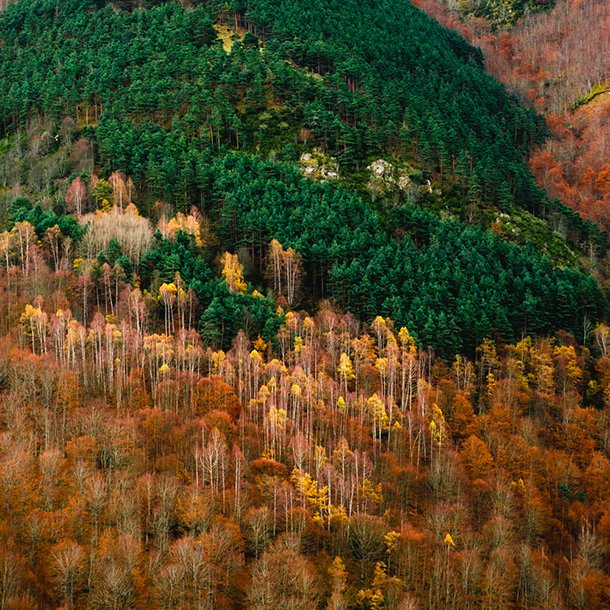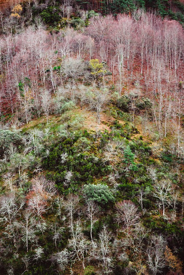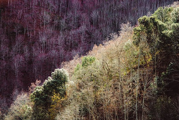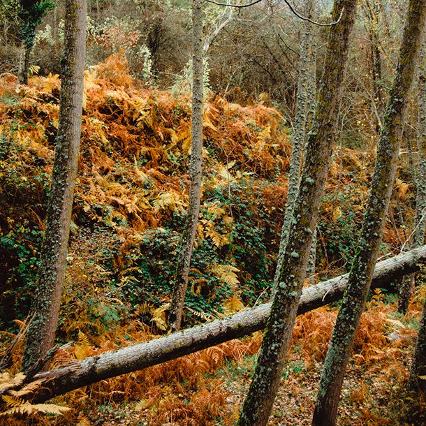 Por otro lado, de las fotografías de Denisa también se deduce una gran sensibilidad estética y emocional hacia el bosque. Lo sublime aparece (y nos invade) en estos retratos en forma de masas de colores, ramas retorcidas orgánicamente, copas imponentes sujetas por troncos…