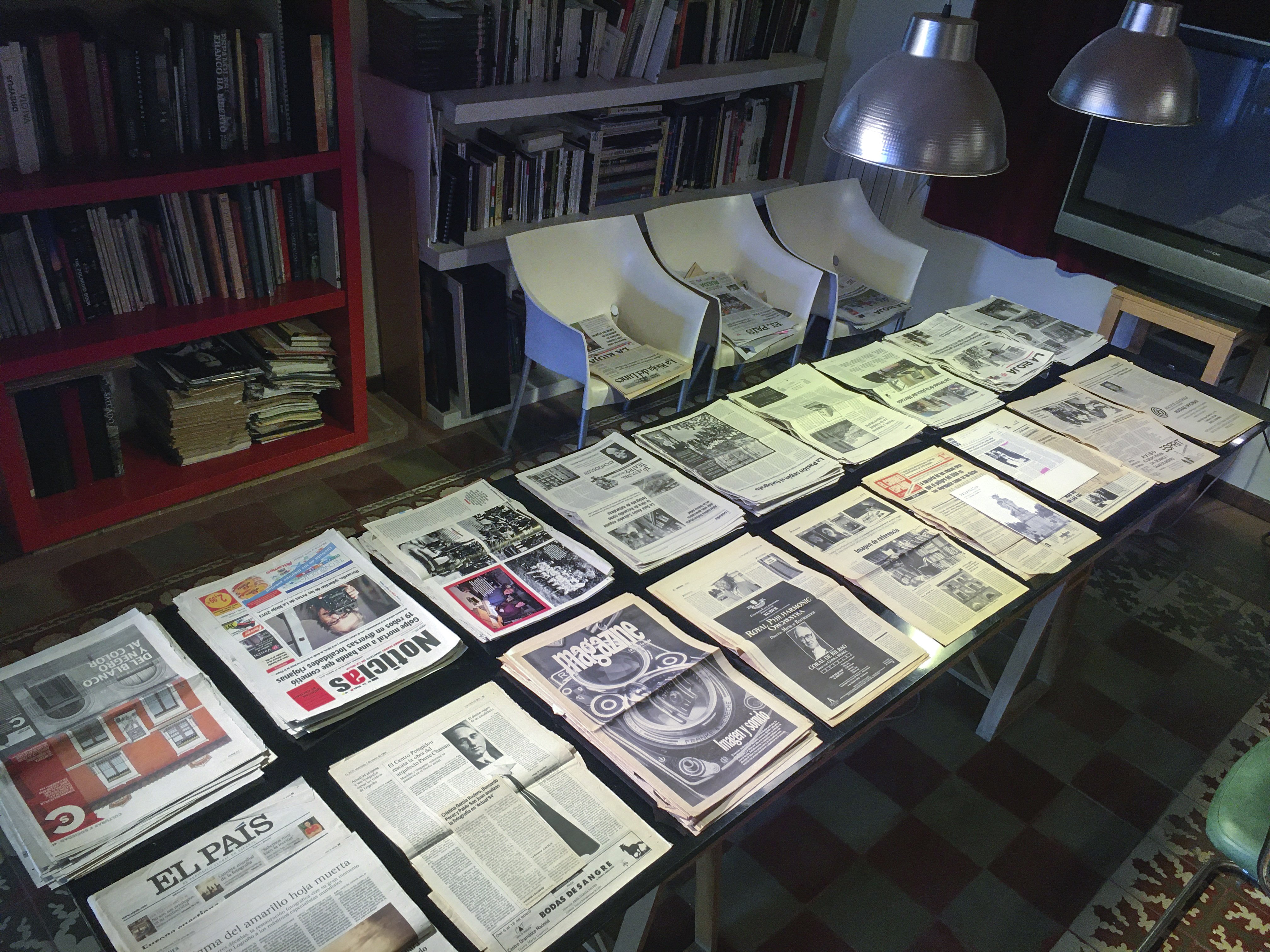 El fotógrafo riojano nos envía vía correo electrónico la imagen que constante la labor emprendida. En una de las estancias del centro, sobre una amplia mesa, comienza a levantarse ordenados montones de portadas y recortes de prensa; artículos, reportajes y entrevistas que dibujan entre palabras e imágenes el relato de una aventura que comenzó en 1982. Rocandio echa la vista atrás. “Tenía entonces 26 años. ¿a quién se le ocurre la locura de iniciar una aventura como esta? … han pasado casi cuarenta años”. La anécdota sobre aquellos días desanda el tiempo. “Era el día anterior a la inauguración de la galería; estaba subido a una escalera pintando una de las paredes y me caí arrastrando el cubo de la pintura conmigo”.