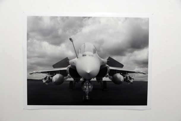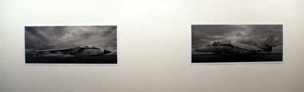 Una mirada detenida descubre inquietantes paisajes. Sobre los aviones, detenidos en la pista de aterrizaje, dominan siempre negros nubarrones. Los cazas se muestren frontalmente o desde su parte trasera siempre parecen dirigirse o llegar desde la tormenta. Quizá una metáfora de la utilidad de estas máquinas. Apunta el comisario de la exposición, Santiago Olmo, a la condición de fotografía ornamental de 'Escenas de caza' y define las instantáneas que retratan a los aviones de “bodegones que retratan naturalezas muertas”.
