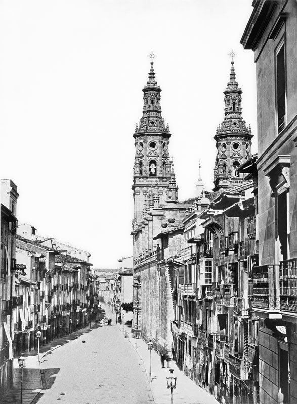 La calle del Mercado –hoy Portales– y más concretamente su inicio desde el Este, será la vista más fotografiada de la ciudad de Logroño, junto al monumento ecuestre del General Espartero. La calle Portales era en el siglo XIX la arteria más importante de la ciudad; en ella se alojaba el mejor comercio, nos llevaba a su centro natural: la plaza del Mercado, presidida por las torres gemelas de la catedral, y como colofón los conventos de San Agustín y de La Merced cerraban la perspectiva de la calle. Todo lo que importaba se cocía en esta calle, por lo que no es de extrañar que la mayoría de los fotógrafos que plantaban su trípode en Logroño repitieran una y otra vez la misma toma, orientando la cámara hacia el mismo lugar. La composición es perfecta, con una delicada y larga perspectiva que define la calle; y por si fuera poco, cuando la fuga empieza a perderse aparecen en vertical las dos torres de La Redonda, compensando el excesivo espacio en altura que quedaría de no existir esta construcción.