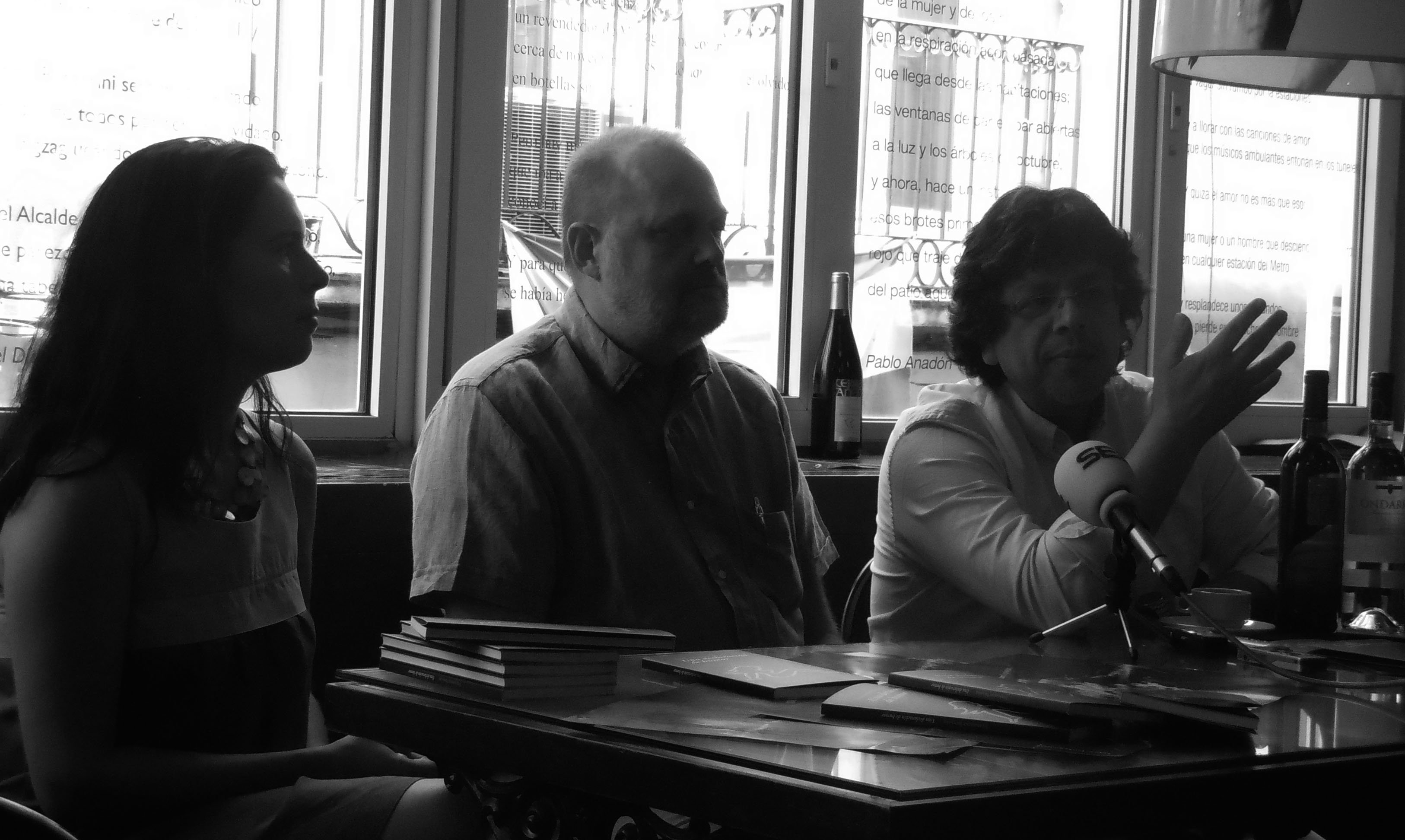 Fotografía de la presentación: El escritor, Fernando Iwasaki, junto a los responsables de Café Bretón y Bodegas Olarra.